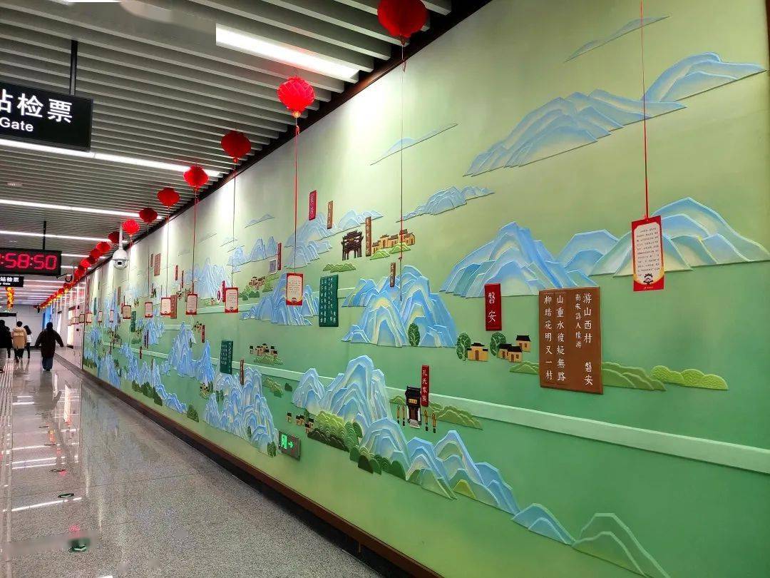 站廳主浮雕墻用八婺大地優美的青山綠水和濃厚的歷史人文底蘊,來展現雙星爭華氣質,比拼爭先精神。而這一創意與虎年春晚上的《只此青綠》節目背景《千里江山圖》不謀而合。