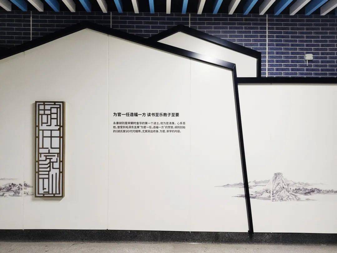 用江南水鄉的黑瓦白墻做底,嵌入金華各縣市的優秀家風家訓,表達“禮義廉恥孝悌忠信”。同時,還設置了幾枚銅鏡,方便來往的行人稍停腳步整理衣冠。